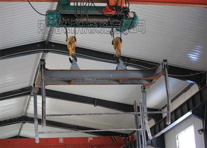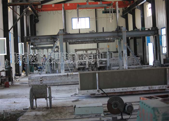 翻轉(zhuǎn)吊具把模具空中翻轉(zhuǎn)90度以后脫模把坯體連同模具側(cè)板放置在切割臺(tái)上,縱向切割裝置通過電機(jī)帶動(dòng)自身行走,對(duì)放置于切割臺(tái)上的坯體進(jìn)行行走切割,切割完成后行走至?xí)和N恢?,橫向切割裝置通過電機(jī)帶動(dòng)自身行走到坯體中央停止后再進(jìn)行水平式切割,橫切架自上而下垂直降落切割直至上升復(fù)位