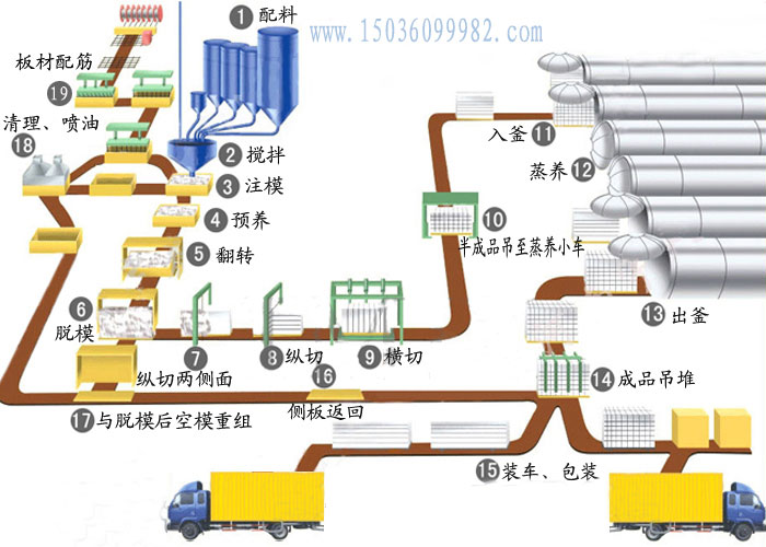 原材料均由汽車運入廠內,粉煤灰(或砂、石粉)在原材料場集中,使用時用裝運入料斗。袋裝水泥或散裝水泥在水泥庫內儲存。使用時用裝運入料斗。化學品、鋁粉等分別放在化學品庫、鋁粉庫,使用時分別裝運至生產車間。